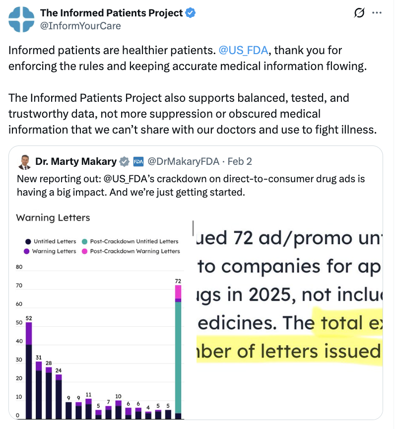 In fact, for over thirty years, the FDA has ensured drug ads are accurate, balanced, and educational. Companies running drug ads must present side effects clearly. They must avoid misleading claims. They must substantiate what they say. These standards are applied consistently across the entire industry. In 2025 alone, the FDA issued over 200 enforcement letters regarding prescription drug advertisements, underscoring that oversight isn’t theoretical, but ongoing.
